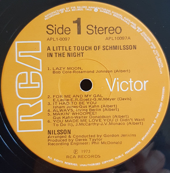 ARTIST: Nilsson LABEL: RCA Victor CAT: APL1-0097 PRESSING: NZ YEAR: 1973 RPM: 33 FORMAT: 12 DISC/S: 1 GENRE: JazzPop STYLE: Jazz COVER CONDITION: VG VINYL CONDITION: VG+ USED OR NEW: Secondhand