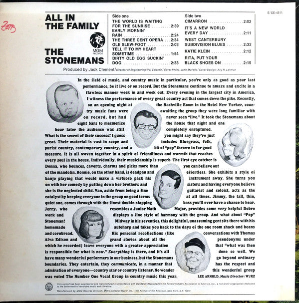 ARTIST: The Stonemans LABEL: MGM CAT: SE 4511 PRESSING: US YEAR: 1968 RPM: 33 FORMAT: 12 DISC/S: 1 GENRE: BluegrassFolk STYLE: Bluegrass COVER CONDITION: VG+ VINYL CONDITION: NM USED OR NEW: Secondhand