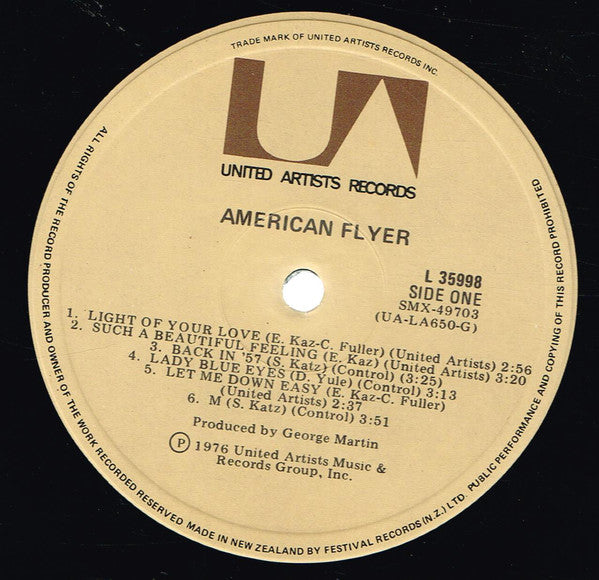 ARTIST: American Flyer LABEL: United Artists Records CAT: L-35998 PRESSING: NZ YEAR: 1976 RPM: 33 FORMAT: 12 DISC/S: 1 GENRE: Rock STYLE: COVER CONDITION: VG+ VINYL CONDITION: VG++ USED OR NEW: Secondhand