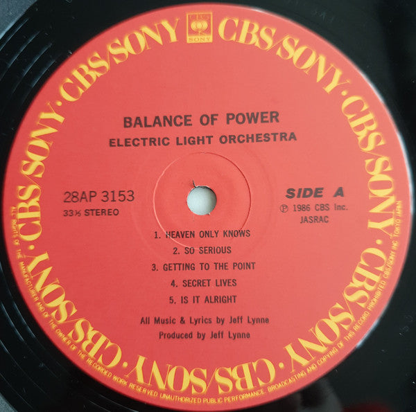 ARTIST: Electric Light Orchestra LABEL: CBS / Sony CAT: 28AP 3153 PRESSING: Japan YEAR: 1986 RPM: 33 FORMAT: 12 DISC/S: 1 GENRE: STYLE: COVER CONDITION: NM VINYL CONDITION: M- USED OR NEW: