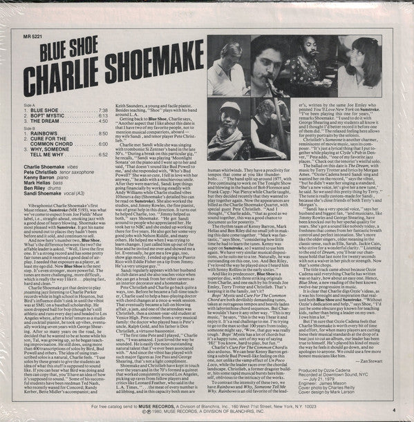 ARTIST: Charlie Shoemake LABEL: Muse Records CAT: MR 5221 PRESSING: US YEAR: 1980 RPM: 33 FORMAT: 12 DISC/S: 1 GENRE: Jazz STYLE: 0 COVER CONDITION: VG+ VINYL CONDITION: VG+ USED OR NEW: Secondhand