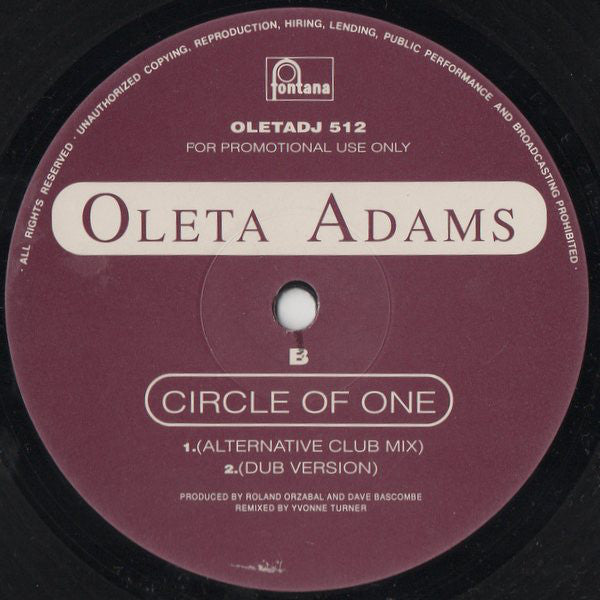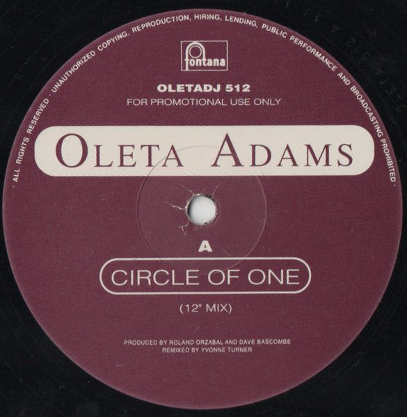 ARTIST: Oleta Adams LABEL: Fontana CAT: OLETADJ 512 PRESSING: UK YEAR: 1991 RPM: 45 FORMAT: 12 DISC/S: 1 GENRE: ElectronicaFunk/Soul STYLE: Funk/Soul COVER CONDITION: Generic VINYL CONDITION: VG++ USED OR NEW: Secondhand