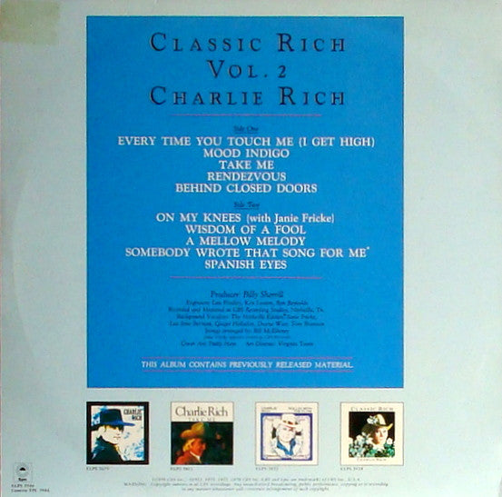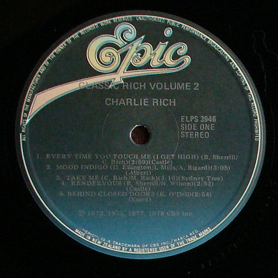 ARTIST: Charlie Rich LABEL: Epic CAT: ELPS 3946 PRESSING: NZ YEAR: 1978 RPM: 33 FORMAT: 12 DISC/S: 1 GENRE: Country STYLE: COVER CONDITION: VG++ VINYL CONDITION: NM USED OR NEW: Secondhand