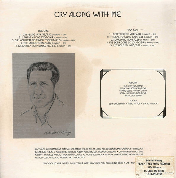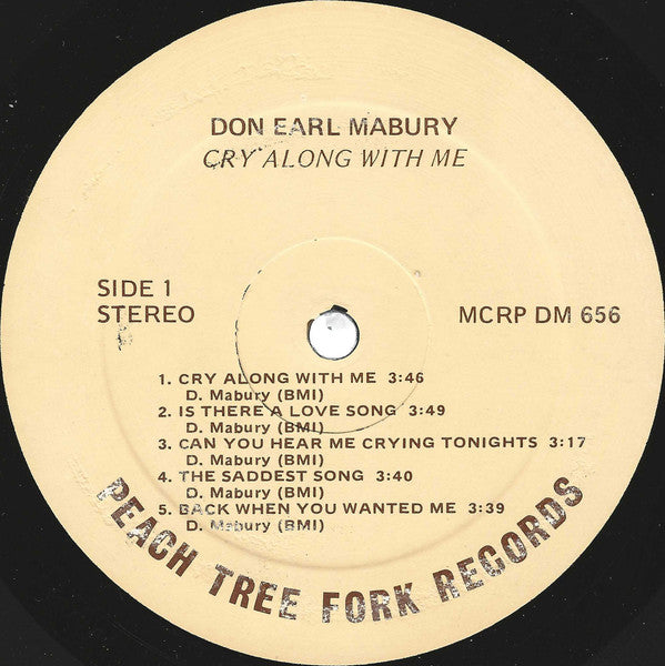 ARTIST: Don Earl Mabury LABEL: Peach Tree Fork Records CAT: MCRP DM 656 PRESSING: US YEAR: RPM: 33 FORMAT: 12 DISC/S: 1 GENRE: CountryPop STYLE: Country COVER CONDITION: NM VINYL CONDITION: NM USED OR NEW: Secondhand