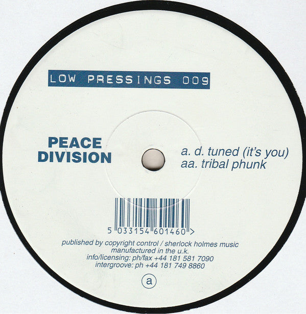 ARTIST: Peace Division LABEL: Low Pressings CAT: LOW PRESSINGS 009 PRESSING: UK YEAR: 1997 RPM: 33 FORMAT: 12 DISC/S: 1 GENRE: ElectronicaTech House STYLE: Tech House COVER CONDITION: Generic VINYL CONDITION: VG USED OR NEW: Secondhand