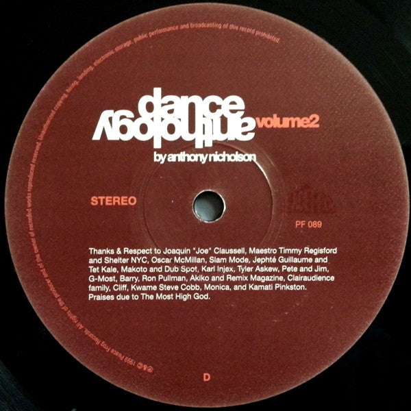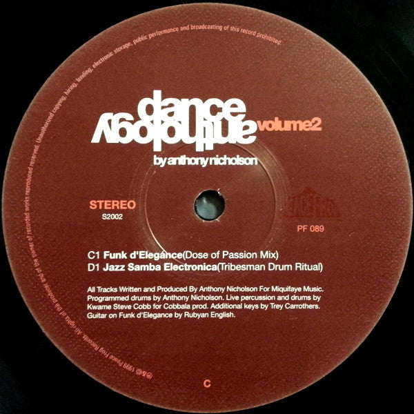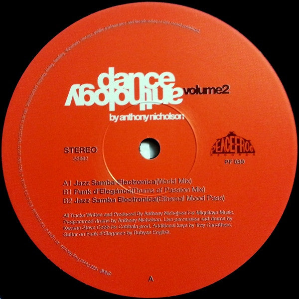 ARTIST: Anthony Nicholson 2 X 12" LABEL: Peacefrog Records CAT: PF 089 PRESSING: UK YEAR: 1999 RPM: 33 FORMAT: 12 DISC/S: 2 GENRE: Deep HouseElectronica STYLE: Deep House COVER CONDITION: Generic VINYL CONDITION: VG+ / VG+ USED OR NEW: Secondhand