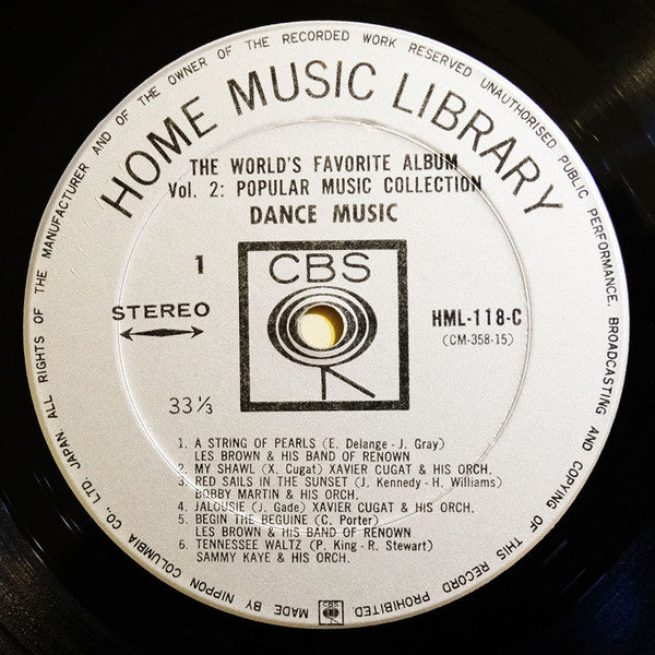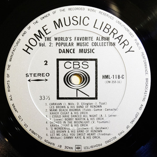 ARTIST: Les Brown And His Band Of Renown, Xavier Cugat And His Orchestra, Bobby Martin And His Orchestra, Sammy Kaye And His Orchestra  LABEL: CBS CAT: HML-118-C PRESSING: Japan YEAR: 1966 RPM: 33 FORMAT: 12 DISC/S: 1 GENRE: JazzLatin STYLE: Latin COVER CONDITION: VG+ VINYL CONDITION: VG+ USED OR NEW: Secondhand