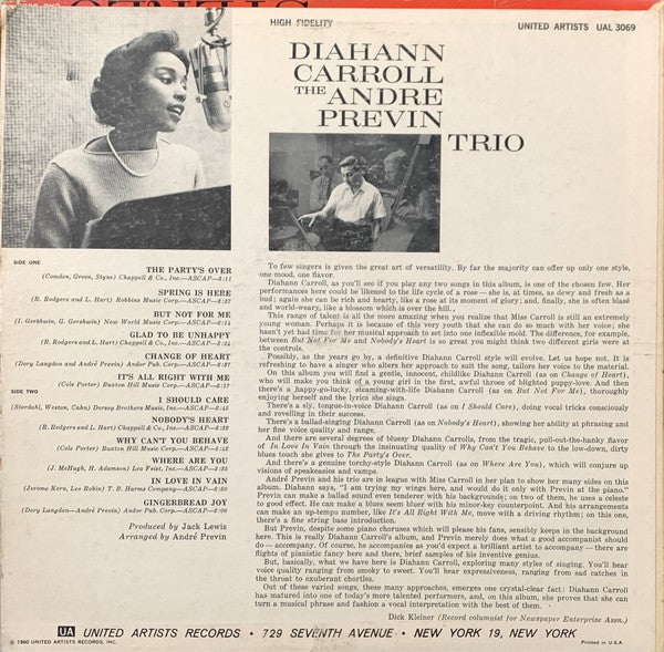 ARTIST: Diahann Carroll, The Andre Previn Trio LABEL: United Artists CAT: UAL 3069 PRESSING: US YEAR: 1960 RPM: 33 FORMAT: 12 DISC/S: 1 GENRE: Jazz STYLE: 0 COVER CONDITION: VG VINYL CONDITION: NM USED OR NEW: Secondhand