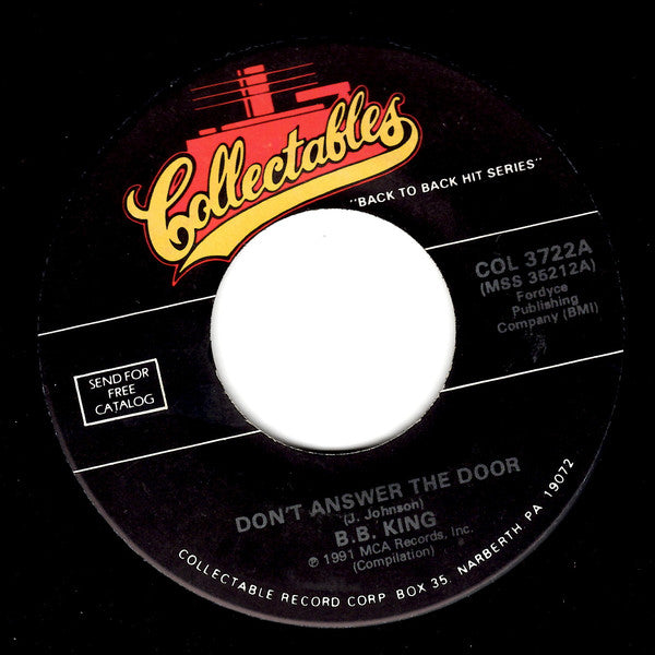 ARTIST: BB King LABEL: Collectables CAT: COL 3722 PRESSING: US YEAR: 0 RPM: 45 FORMAT: 7 DISC/S: 1 GENRE: BluesChicago Blues STYLE: Chicago Blues COVER CONDITION: Generic VINYL CONDITION: VG+ USED OR NEW: Secondhand