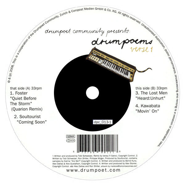 ARTIST: Various Artists Feat Soultourist, Kawabata… LABEL: Drumpoet Community CAT: dpc 012-1 PRESSING: Switzerland YEAR: 2008 RPM: 33 FORMAT: 12 DISC/S: 1 GENRE: Deep HouseElectronica STYLE: Deep House COVER CONDITION: NM- VINYL CONDITION: NM USED OR NEW: Secondhand