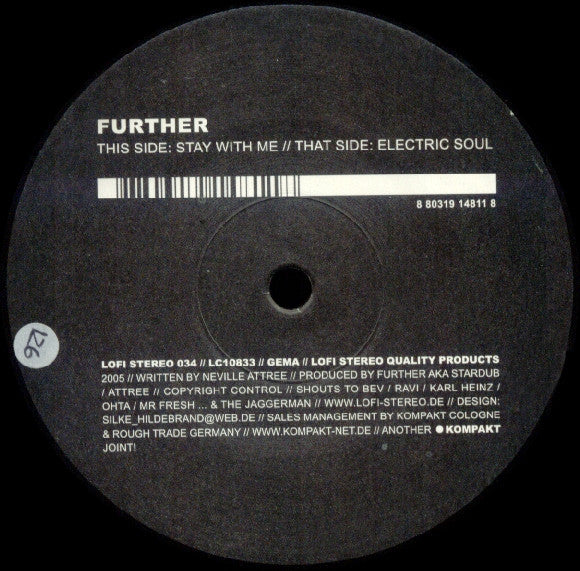 ARTIST: Further LABEL: Lo-Fi Stereo CAT: LOFI STEREO 034 PRESSING: Germany YEAR: 2005 RPM: 33 FORMAT: 12 DISC/S: 1 GENRE: ElectronicaTech House STYLE: Tech House COVER CONDITION: Generic VINYL CONDITION: NM USED OR NEW: Secondhand