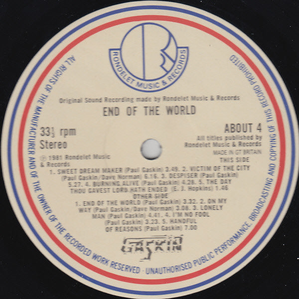 ARTIST: Gaskin LABEL: Rondelet Music And Records CAT: ABOUT 4 PRESSING: UK YEAR: 1981 RPM: 33 FORMAT: 12 DISC/S: 1 GENRE: Heavy MetalRock STYLE: Heavy Metal COVER CONDITION: VG- VINYL CONDITION: VG- USED OR NEW: Secondhand