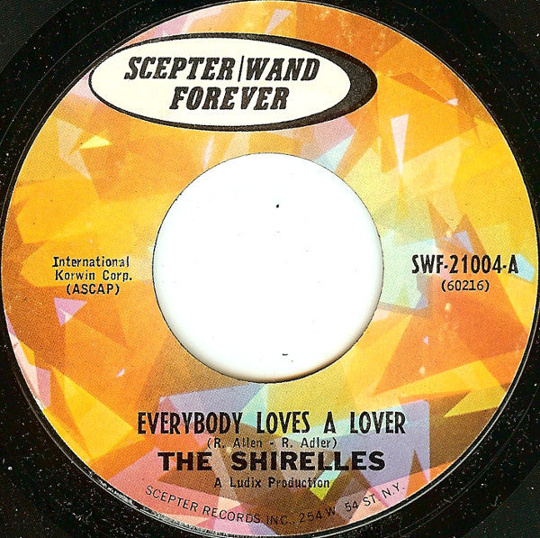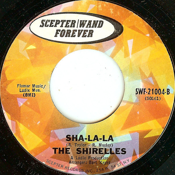 ARTIST: The Shirelles LABEL: Scepter/Wand Forever CAT: SWF-21004 PRESSING: US YEAR: 0 RPM: 45 FORMAT: 7 DISC/S: 1 GENRE: Funk/SoulSoul STYLE: Soul COVER CONDITION: Generic VINYL CONDITION: G USED OR NEW: Secondhand