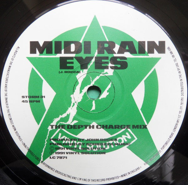 ARTIST: Midi Rain LABEL: Vinyl Solution CAT: STORM 31 PRESSING: UK YEAR: 1991 RPM: 45 FORMAT: 12 DISC/S: 1 GENRE: ElectronicaTechno STYLE: Techno COVER CONDITION: VG+ VINYL CONDITION: NM USED OR NEW: Secondhand