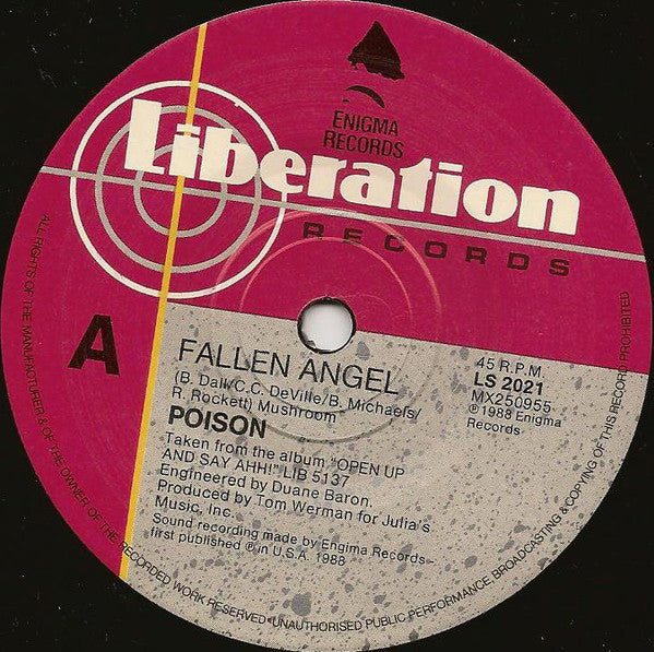 ARTIST: Poison LABEL: Liberation CAT: LS 2021 PRESSING: Australia YEAR: 1988 RPM: 45 FORMAT: 7 DISC/S: 1 GENRE: Hard RockRock STYLE: Hard Rock COVER CONDITION: Generic VINYL CONDITION: VG++ USED OR NEW: Secondhand