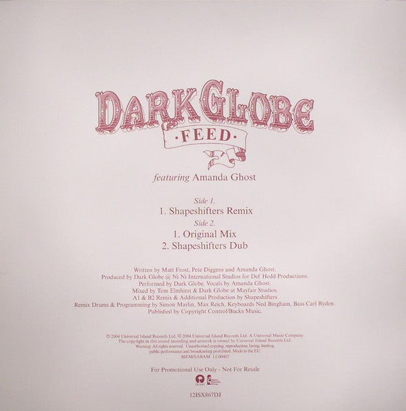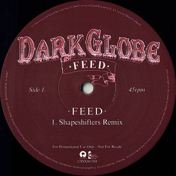 ARTIST: Dark Globe LABEL: Island Records CAT: 12ISX867DJ PRESSING: Europe YEAR: 2004 RPM: 33 FORMAT: 12 DISC/S: 1 GENRE: ElectronicaHouse STYLE: House COVER CONDITION: VG+ VINYL CONDITION: VG+ USED OR NEW: Secondhand