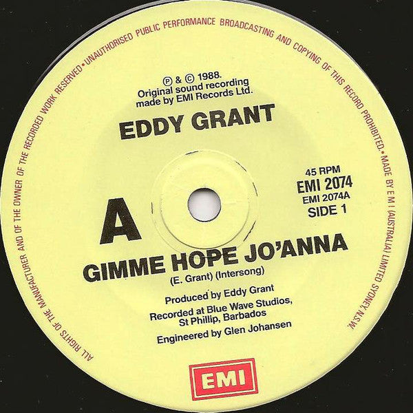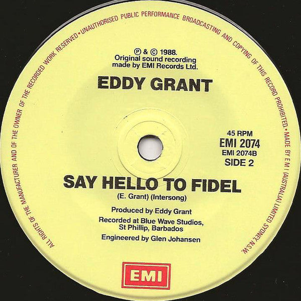 ARTIST: Eddy Grant LABEL: EMI CAT: EMI2074 PRESSING: Australasia YEAR: 1988 RPM: 45 FORMAT: 7 DISC/S: 1 GENRE: DubElectronica STYLE: Dub COVER CONDITION: Generic VINYL CONDITION: VG+ USED OR NEW: Secondhand