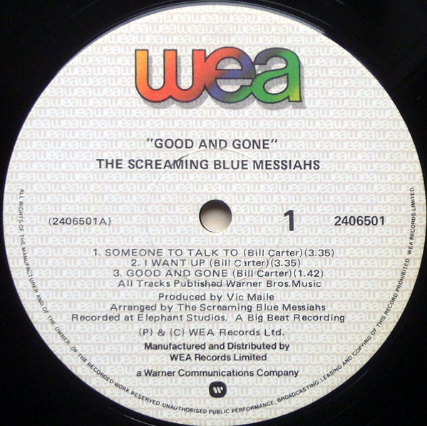 ARTIST: The Screaming Blue Messiahs LABEL: WEA CAT: 240 650-1 PRESSING: NZ YEAR: 1985 RPM: 33 FORMAT: 12 DISC/S: 1 GENRE: Rock STYLE: COVER CONDITION: NM- VINYL CONDITION: NM- USED OR NEW: Secondhand