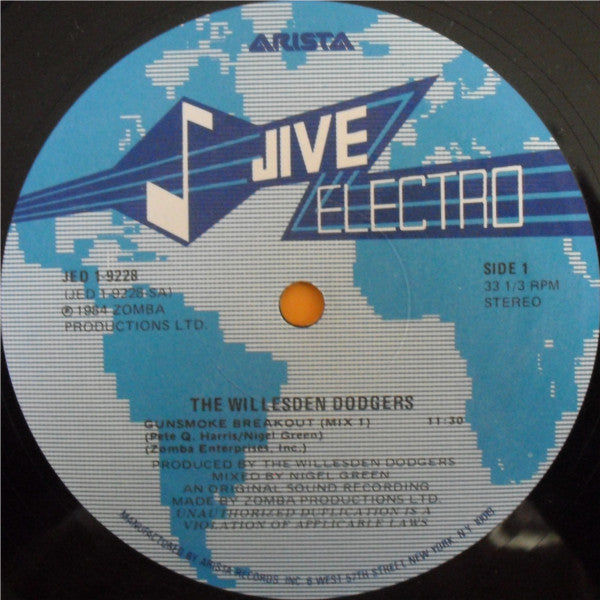 ARTIST: The Willesden Dodgers LABEL: Jive Electro CAT: JED1-9228 PRESSING: US YEAR: 1984 RPM: 33 FORMAT: 12 DISC/S: 1 GENRE: BreakbeatElectronica STYLE: Breakbeat COVER CONDITION: VG VINYL CONDITION: VG USED OR NEW: Secondhand