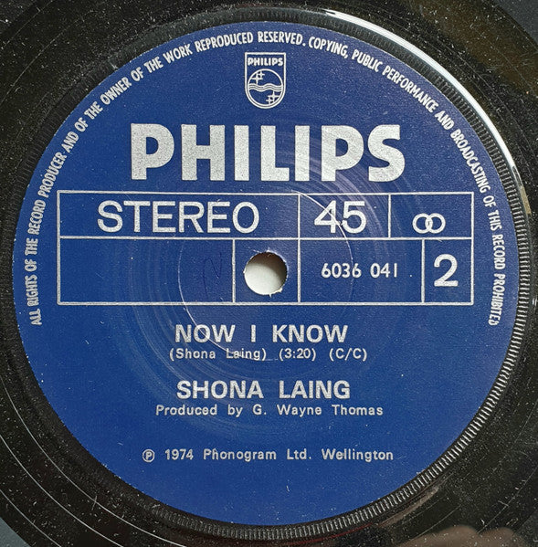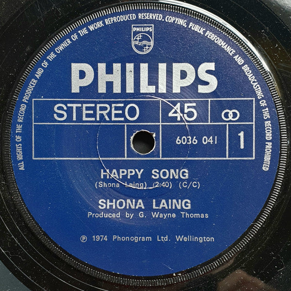 ARTIST: Shona Laing LABEL: Philips CAT: 6036 041 PRESSING: Australia YEAR: 1974 RPM: 45 FORMAT: 7 DISC/S: 1 GENRE: Kiwi MusicPop STYLE: Kiwi Music COVER CONDITION: VG+ VINYL CONDITION: Generic USED OR NEW: Secondhand