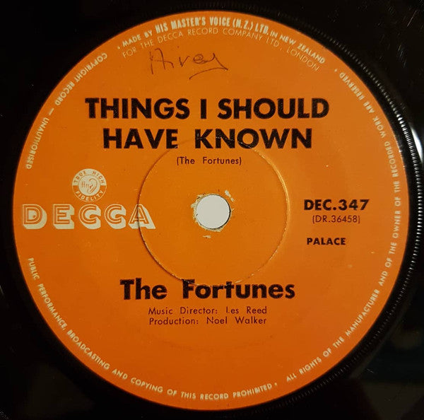 ARTIST: The Fortunes LABEL: Decca CAT: DEC.347 PRESSING: NZ YEAR: 1965 RPM: 45 FORMAT: 7 DISC/S: 1 GENRE: PopRock STYLE: Pop COVER CONDITION: Generic VINYL CONDITION: G+ USED OR NEW: Secondhand