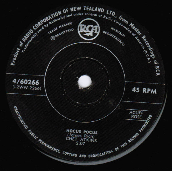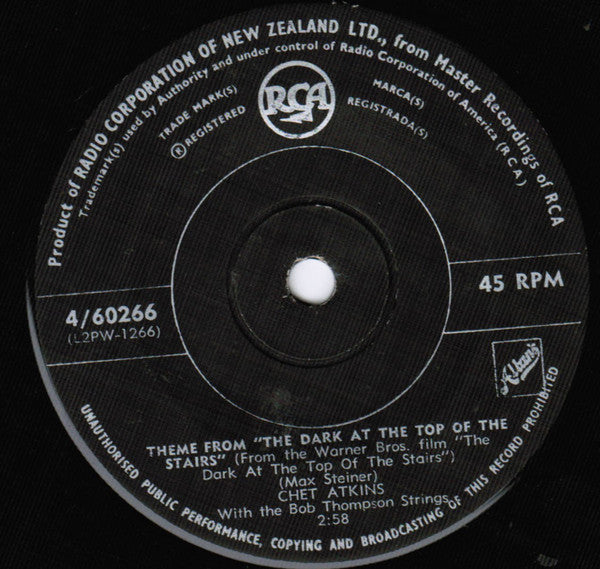 ARTIST: Chet Atkins LABEL: RCA CAT: 4/60266 PRESSING: NZ YEAR: 1960 RPM: 45 FORMAT: 7 DISC/S: 1 GENRE: Folk STYLE: COVER CONDITION: Generic VINYL CONDITION: VG USED OR NEW: Secondhand