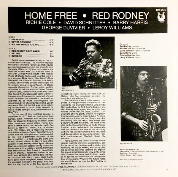 ARTIST: Red Rodney LABEL: Muse Records CAT: MR 5135 PRESSING: US YEAR: 1979 RPM: 33 FORMAT: 12 DISC/S: 1 GENRE: Jazz STYLE: COVER CONDITION: VG++ VINYL CONDITION: NM USED OR NEW: Secondhand