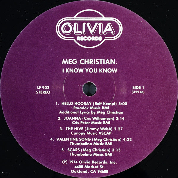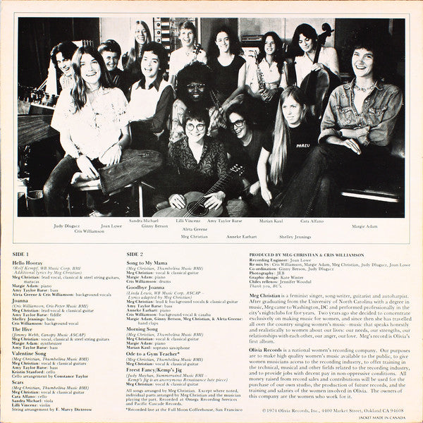ARTIST: Meg Christian LABEL: Olivia Records CAT: LF 902 PRESSING: US YEAR: 1974 RPM: 33 FORMAT: 12 DISC/S: 1 GENRE: Folk STYLE: 0 COVER CONDITION: VG+ VINYL CONDITION: VG+ USED OR NEW: Secondhand