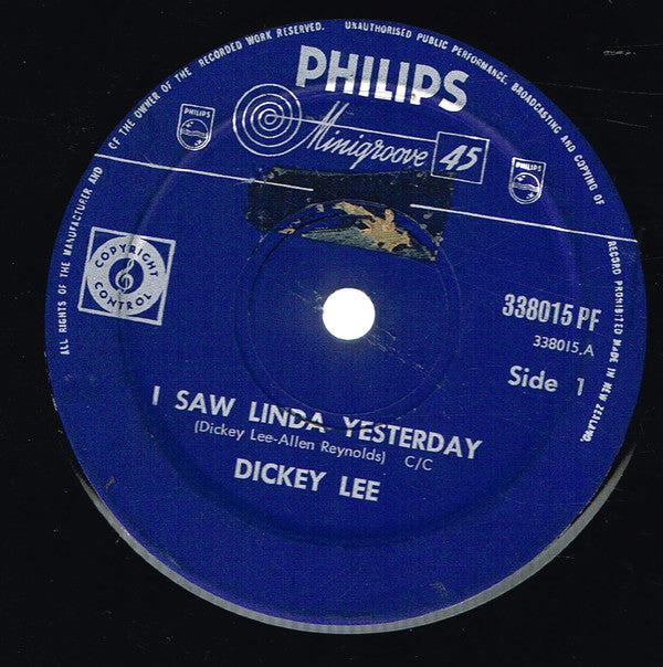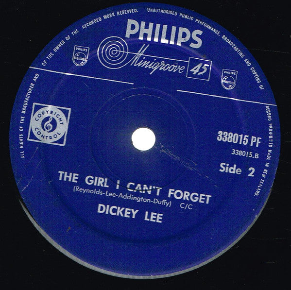 ARTIST: Dicky Lee LABEL: Philips CAT: 338015 PF PRESSING: NZ YEAR: 1962 RPM: 45 FORMAT: 7 DISC/S: 1 GENRE: RockRock n Roll STYLE: Rock n Roll COVER CONDITION: Generic VINYL CONDITION: VG+ USED OR NEW: Secondhand