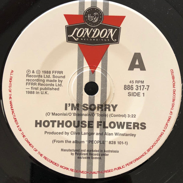 ARTIST: Hothouse Flowers LABEL: London Records CAT: 886 317-7 PRESSING: Australasia YEAR: 1988 RPM: 45 FORMAT: 7 DISC/S: 1 GENRE: Rock STYLE: 0 COVER CONDITION: Generic VINYL CONDITION: VG- USED OR NEW: Secondhand