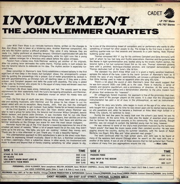 ARTIST: The John Klemmer Quartets LABEL: Cadet CAT: LPS 797 PRESSING: US YEAR: 1967 RPM: 33 FORMAT: 12 DISC/S: 1 GENRE: JazzSoul Jazz STYLE: Soul Jazz COVER CONDITION: VG+ VINYL CONDITION: VG+ USED OR NEW: Secondhand