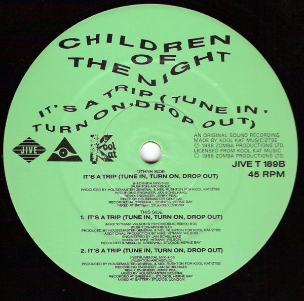 ARTIST: Children Of The Night LABEL: Jive CAT: JIVE T 189 PRESSING: UK YEAR: 1988 RPM: 45 FORMAT: 12 DISC/S: 1 GENRE: Acid HouseElectronica STYLE: Acid House COVER CONDITION: VG+ VINYL CONDITION: VG USED OR NEW: Secondhand