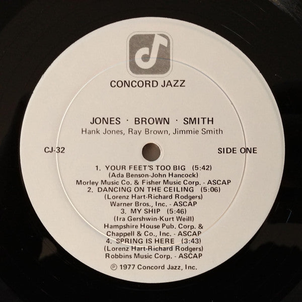 ARTIST: Jones, Brown, Smith LABEL: Concord Jazz CAT: CJ-32 PRESSING: US YEAR: 1977 RPM: 33 FORMAT: 12 DISC/S: 1 GENRE: Jazz STYLE: COVER CONDITION: VG+ VINYL CONDITION: NM USED OR NEW: Secondhand