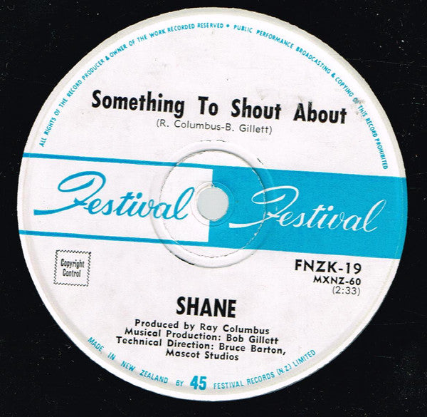 ARTIST: Shane LABEL: Festival CAT: FNZK-19 PRESSING: NZ YEAR: 1968 RPM: 45 FORMAT: 7 DISC/S: 1 GENRE: PopRock STYLE: Pop COVER CONDITION: Generic VINYL CONDITION: G- USED OR NEW: Secondhand