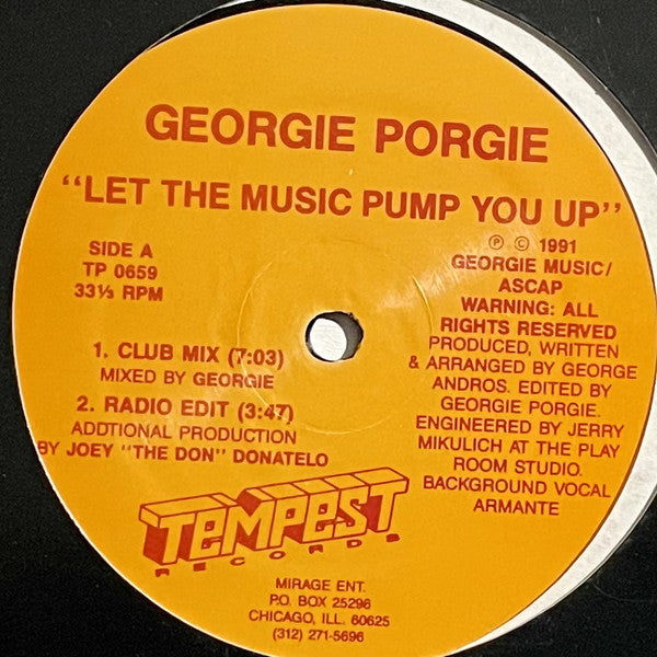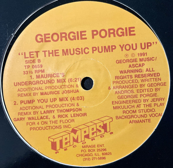 ARTIST: Georgie Porgie LABEL: Tempest Records CAT: TP 0659 PRESSING: US YEAR: 1991 RPM: 33 FORMAT: 12 DISC/S: 1 GENRE: ElectronicaGarage House STYLE: Garage House COVER CONDITION: Generic VINYL CONDITION: VG+ USED OR NEW: Secondhand