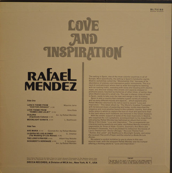 ARTIST: Rafael Mendez LABEL: Decca CAT: DL 75185 PRESSING: US YEAR: 1970 RPM: 33 FORMAT: 12 DISC/S: 1 GENRE: Jazz STYLE: 0 COVER CONDITION: VG VINYL CONDITION: VG+ USED OR NEW: Secondhand