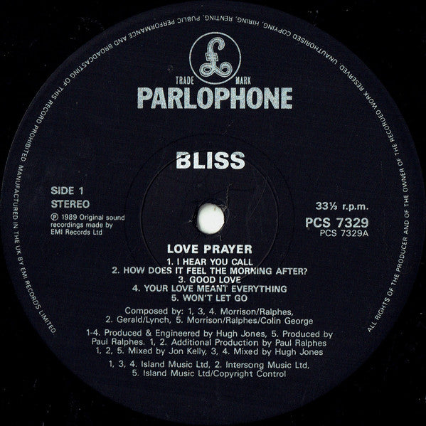 ARTIST: Bliss LABEL: Parlophone CAT: PCS 7329 PRESSING: UK YEAR: 1989 RPM: 33 FORMAT: 12 DISC/S: 1 GENRE: BluesRock STYLE: Blues COVER CONDITION: VG+ VINYL CONDITION: NM USED OR NEW: Secondhand