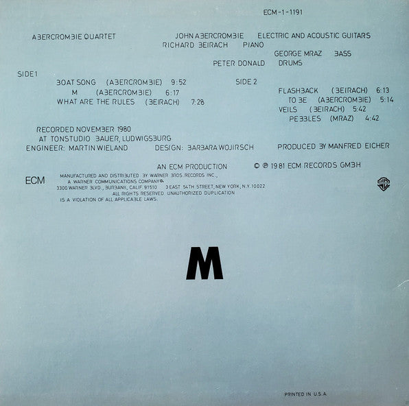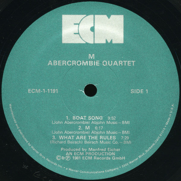ARTIST: Abercrombie Quartet LABEL: ECM Records CAT: ECM 1191 PRESSING: Germany YEAR: 1981 RPM: 33 FORMAT: 12 DISC/S: 1 GENRE: Jazz STYLE: COVER CONDITION: VG+ VINYL CONDITION: VG+ USED OR NEW: Secondhand