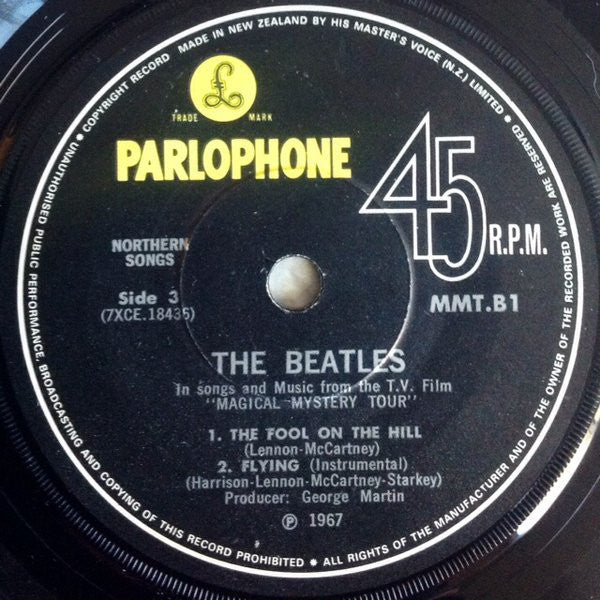 ARTIST: The Beatles 2 x 7" EP LABEL: Parlophone CAT: MMT.A1 / MMT.B1 PRESSING: NZ YEAR: 1967 RPM: 45 FORMAT: 7 DISC/S: 2 GENRE: Psychedelic RockRock STYLE: Psychedelic Rock COVER CONDITION: Generic VINYL CONDITION: VG+ / NM USED OR NEW: Secondhand