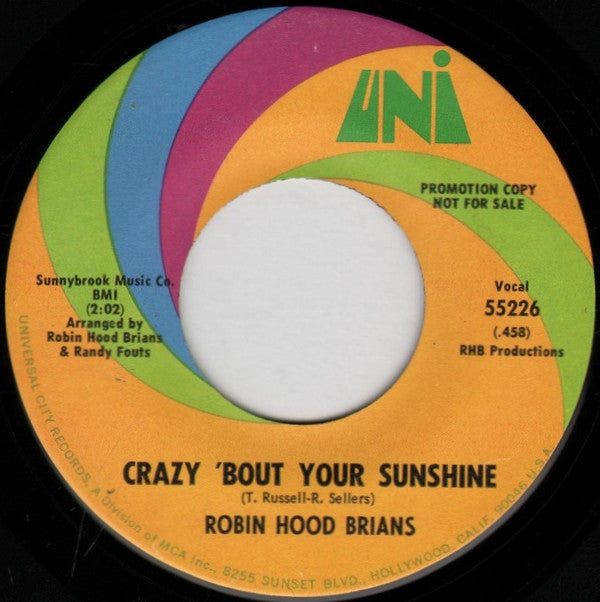 ARTIST: Robin Hood Brians LABEL: UNI Records CAT: 55226 PRESSING: US YEAR: 1970 RPM: 45 FORMAT: 7 DISC/S: 1 GENRE: Rock STYLE: 0 COVER CONDITION: Generic VINYL CONDITION: VG USED OR NEW: Secondhand