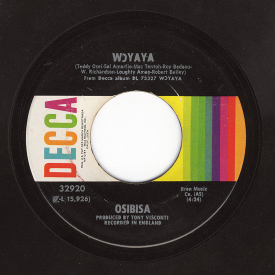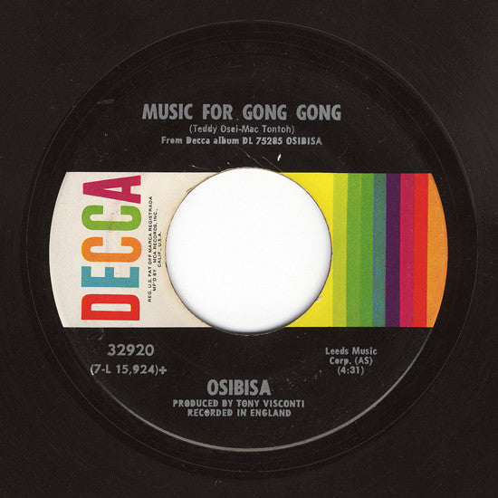 ARTIST: Osibisa 7" LABEL: Decca CAT: 32920 PRESSING: US YEAR: 1971 RPM: 45 FORMAT: 7 DISC/S: 1 GENRE: Afro BeatFunk/Soul STYLE: Afro Beat COVER CONDITION: Generic VINYL CONDITION: VG USED OR NEW: Secondhand