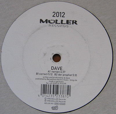 ARTIST: Dave LABEL: Muller Records CAT: MULLER 2012 PRESSING: Germany YEAR: 1998 RPM: 33 FORMAT: 12 DISC/S: 1 GENRE: ElectronicaTechno STYLE: Techno COVER CONDITION: Generic VINYL CONDITION: VG+ USED OR NEW: Secondhand
