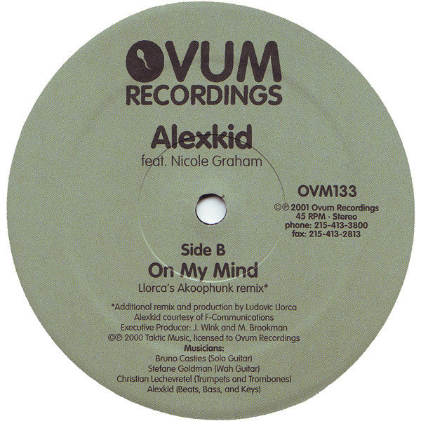 ARTIST: Alexkid Feat Nicole Graham LABEL: Ovum Recordings CAT: OVM133 PRESSING: US YEAR: 2000 RPM: 45 FORMAT: 12 DISC/S: 1 GENRE: Deep HouseElectronica STYLE: Deep House COVER CONDITION: NM- VINYL CONDITION: NM- USED OR NEW: Secondhand