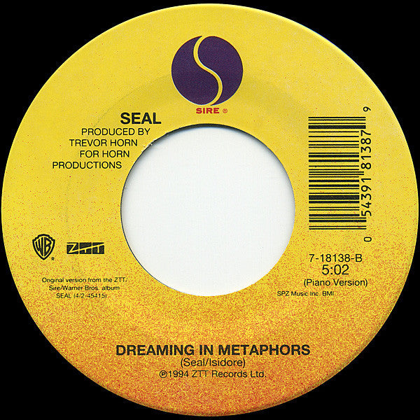 ARTIST: Seal LABEL: Sire CAT: 7-18138 PRESSING: US YEAR: 1994 RPM: 45 FORMAT: 7 DISC/S: 1 GENRE: RockSoft Rock STYLE: Soft Rock COVER CONDITION: Generic VINYL CONDITION: VG+ USED OR NEW: Secondhand