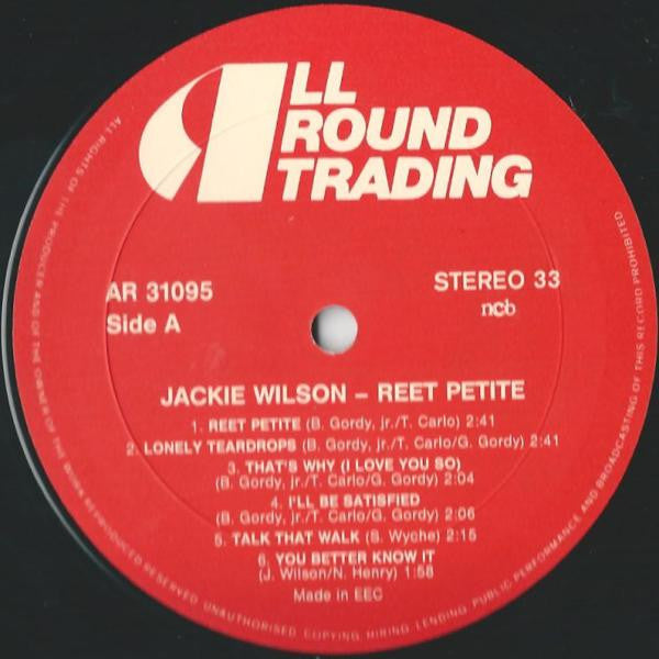 ARTIST: Jackie Wilson LABEL: All Round Trading CAT: AR 31095 PRESSING: Europe YEAR: 1987 RPM: 33 FORMAT: 12 DISC/S: 1 GENRE: Rock STYLE: COVER CONDITION: VG+ VINYL CONDITION: NM USED OR NEW: Secondhand