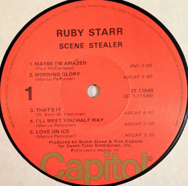 ARTIST: Ruby Starr LABEL: Capitol Records CAT: ST-11549 PRESSING: US YEAR: 1976 RPM: 33 FORMAT: 12 DISC/S: 1 GENRE: RockSouthern Rock STYLE: Southern Rock COVER CONDITION: NM- VINYL CONDITION: NM- USED OR NEW: Secondhand
