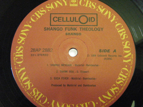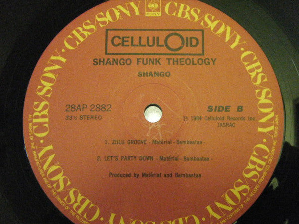 ARTIST: Shango LABEL: CBS/Sony CAT: 28AP 2882 PRESSING: Japan YEAR: 1984 RPM: 33 FORMAT: 12 DISC/S: 1 GENRE: ElectroElectronica STYLE: Electro COVER CONDITION: M- VINYL CONDITION: M- USED OR NEW: Secondhand
