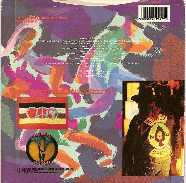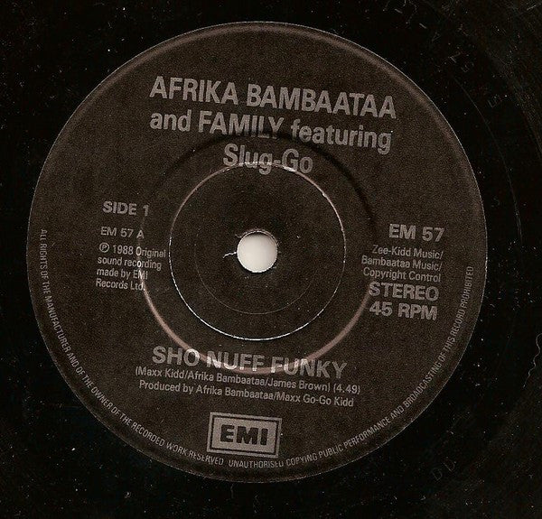 ARTIST: Afrika Bambaataa And Family LABEL: EMI CAT: EM 57 PRESSING: UK YEAR: 1988 RPM: 45 FORMAT: 7 DISC/S: 1 GENRE: ElectronicaFunk/Soul STYLE: Funk/Soul COVER CONDITION: VG++ VINYL CONDITION: VG+ USED OR NEW: Secondhand