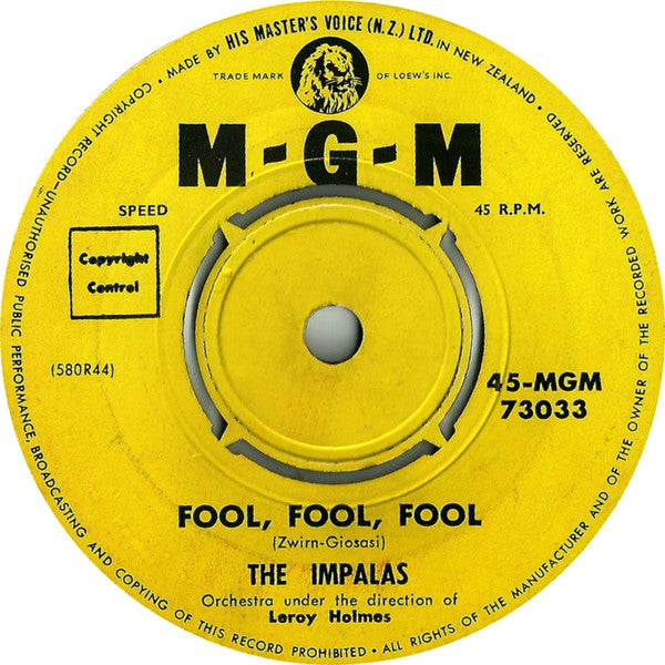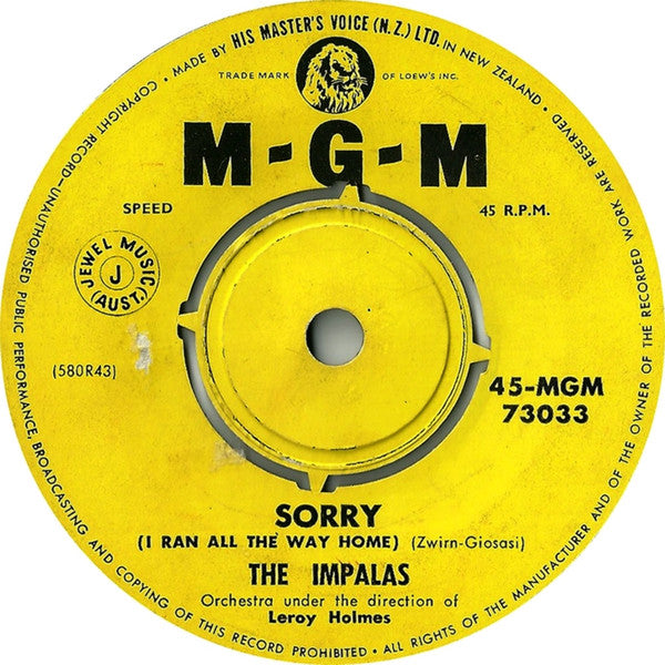 ARTIST: The Impalas LABEL: MGM Records CAT: 45-MGM 73033 PRESSING: NZ YEAR: 1958 RPM: 45 FORMAT: 7 DISC/S: 1 GENRE: RockRock n Roll STYLE: Rock n Roll COVER CONDITION: Generic VINYL CONDITION: G- USED OR NEW: Secondhand