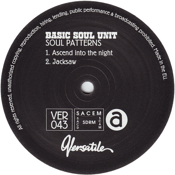 ARTIST: Basic Soul Unit LABEL: Versatile Records CAT: VER043 PRESSING: France YEAR: 2005 RPM: 33 FORMAT: 12 DISC/S: 1 GENRE: ElectronicaTechno STYLE: Techno COVER CONDITION: VG+ VINYL CONDITION: VG+ USED OR NEW: Secondhand